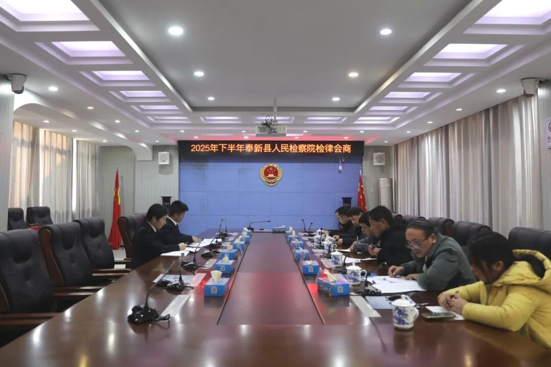 为深入落实最高检、司法部《依法保障律师阅卷权利工作规定》,持续深化检律协作内涵,着力构建亲而有度、清而有为的检律关系,切实保障律师执业权利,提升司法办案质效,12月31日,奉新县人民检察院组织召开2025年下半年检律会商座谈会,县检察院分管副检察长、县司法局分管领导及全县各律师事务所执业律师代表参加会议。